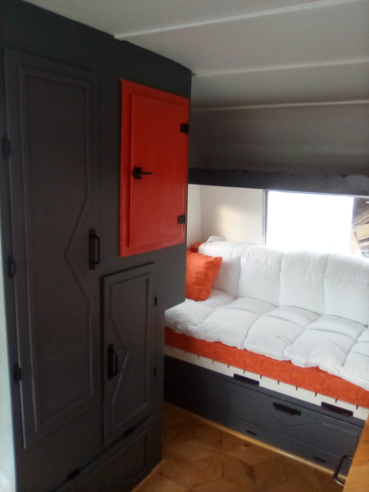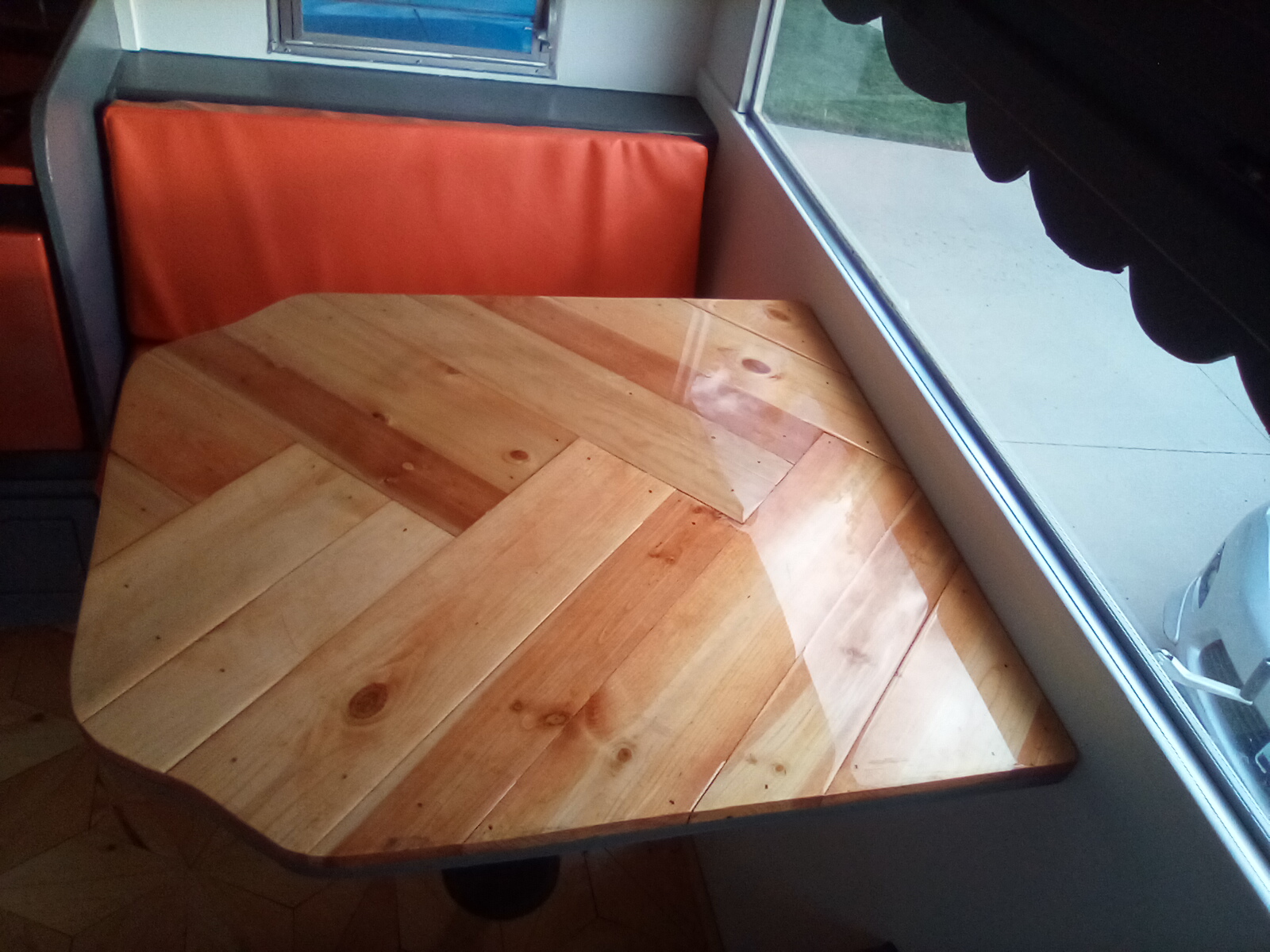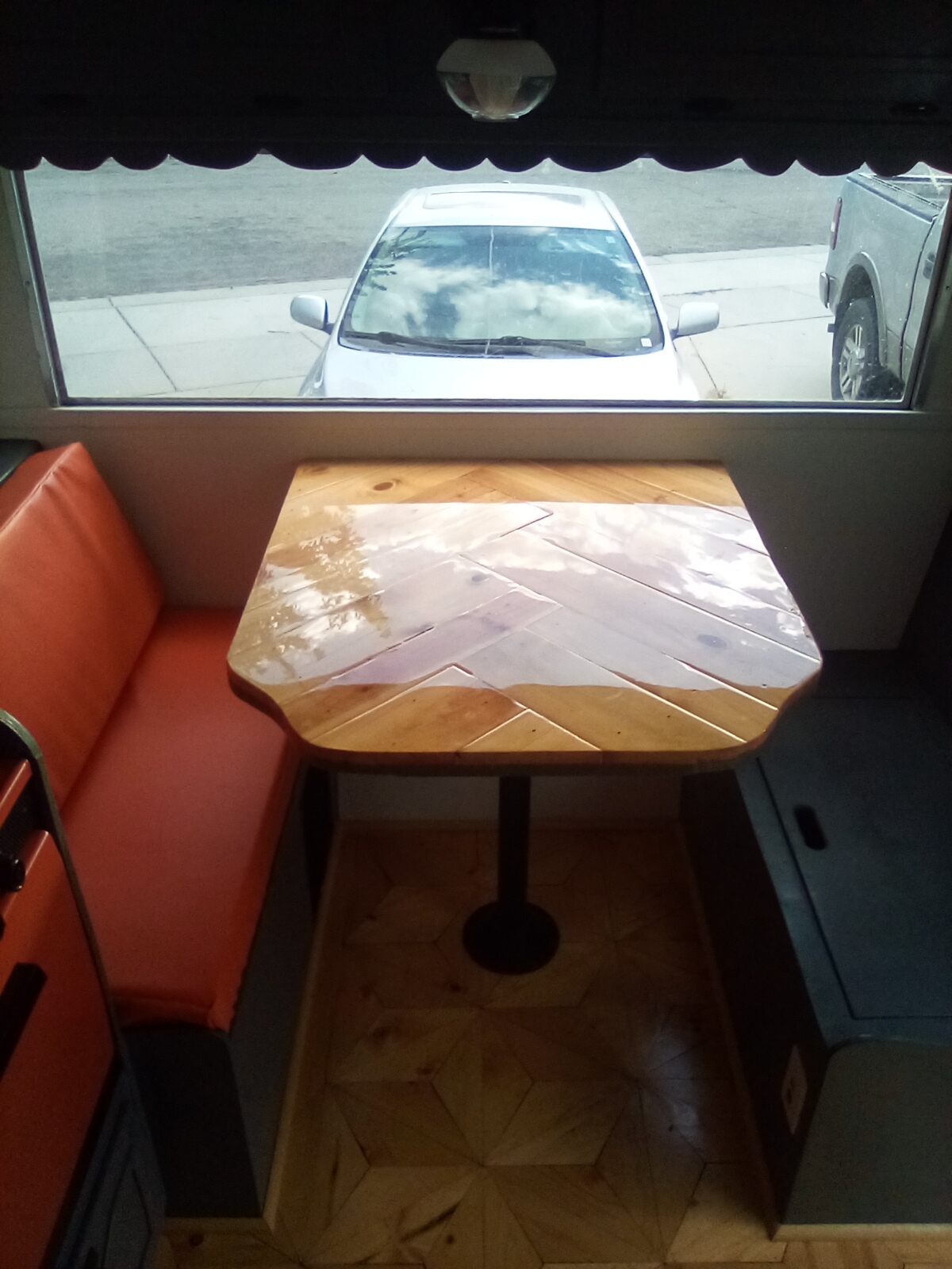 Interior: A complete "down to the studs" refresh featuring a custom-built front dinette table and seats, counter top, hardware, and flooring, to a versatile custom rear bed/couch lounge and storage throughout.